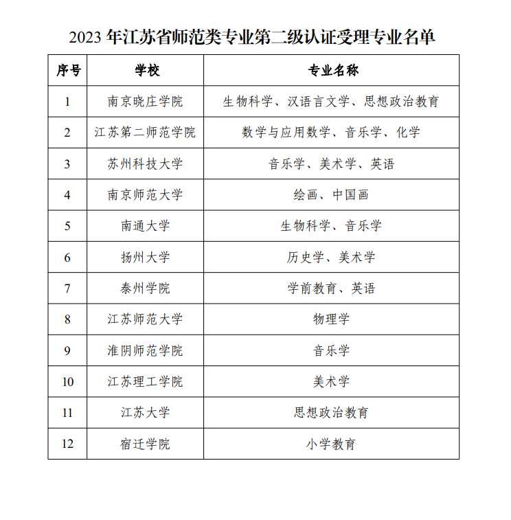 根据《普通高等学校师范类专业认证实施办法(暂行)》(教 师2017〔13〕号)《江苏省普通高等学校师范类专业认证第二级 认证实施办法(试行)》(苏教评〔2018〕2号)文件精神,我校小学教育专业经省教育评估院开展的2023年师范类专业第二级认证受理材料评审和省教育部评估中心确认,成为全省达标度较高的22个专业之一(具体名单见附件)顺利获得受理资格,并于2023年2月15日成功将申请材料上传到认证管理系统。