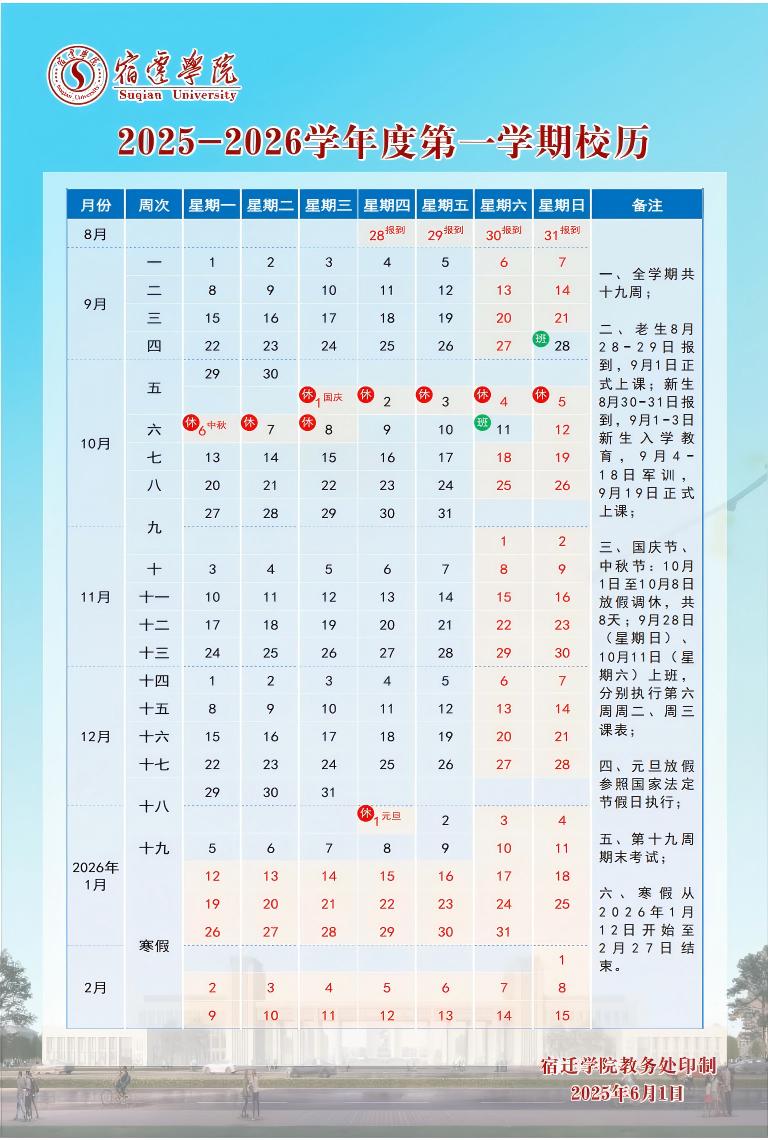 宿迁学院2025-2026学年第一学期校历
