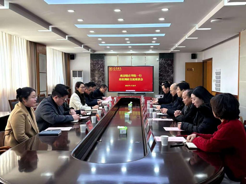 1月28日下午,南京晓庄学院实验室建设与管理处处长周红霞、教务处副处长吴海勇,信息工程学院院长郑豪、商学院院长赵彤、新闻传播学院院长罗荣华等一行8人来校调研交流,围绕京东现代产业学院建设及校企共建实验室等工作开展专题座谈。校党委常委、教务处处长陆海霞主持座谈会,部分二级学院、教务处相关负责人等陪同调研并参会。