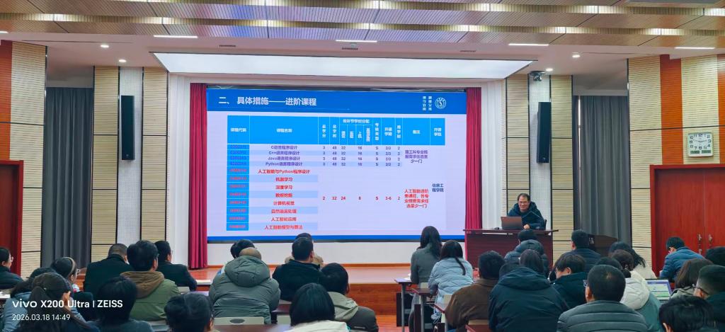 会上,信息工程学院相关专业负责人介绍了学校“人工智能+”课程体系的总体架构与实施方案,重点讲解了通识课、进阶课、交叉课三层递进的课程设置思路,展示了学校在人工智能赋能教育教学改革方面的积极探索与实践路径。