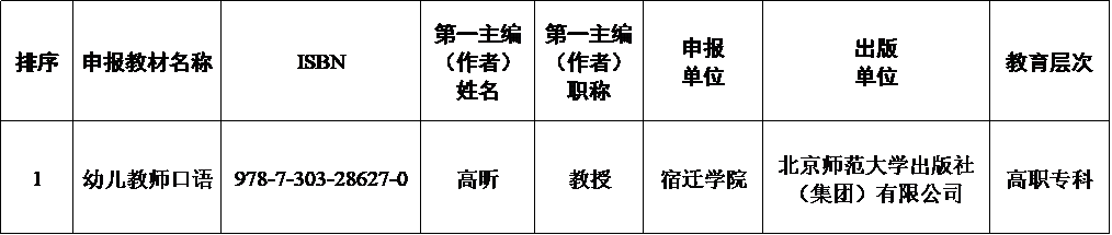 经个人申报、学校审核,现推荐高昕老师主编的教材《幼儿教师口语》申报第二批“十四五”职业教育国家规划教材,具体情况如下: