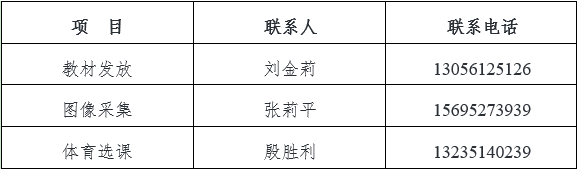 如教材发放、图像采集、体育选课等问题需要咨询,可以按照各项工作联系人信息表,如下表所示,与对应项目负责老师联系咨询处理。