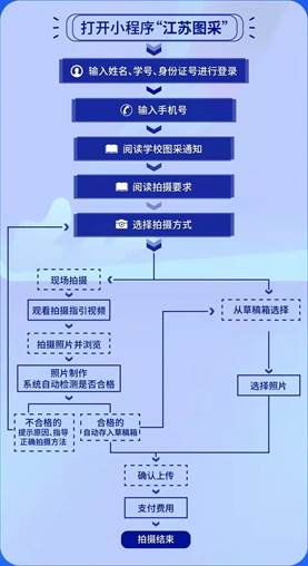 学生在规定时间内到指定地点进行图像采集。登录“江苏图采”微信小程序或关注“江苏省招就中心”公众号,选择“服务指南”中的“图像采集”项目,严格按要求进行在线采集,以免照片无法通过审核,影响使用。学习委员做好采集数据统计并及时在企业微信群里反馈,做到应拍尽拍,不疏不漏。
