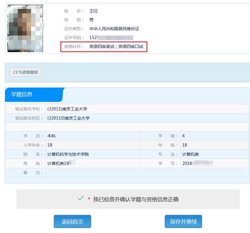 2.在“资格信息确认”界面仔细核对本人照片、姓名、证件号码、笔试报名学校、学号、班级等所有信息。