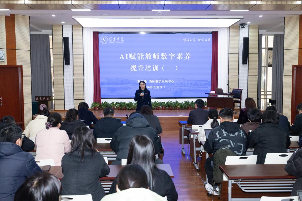 为进一步提升教师运用人工智能技术辅助教学能力,2月21日下午,济南大学丁广乾副教授应邀来校作“AI&知识图谱赋能智慧教学新生态”专题报告。来自二级学院的80余名教师现场参加培训,全体专任教师线上学习,校党委常委、教务处处长陆海霞主持活动。