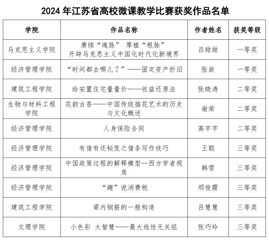 近日,江苏省高等学校教育信息化研究会发布了2024年江苏省高校微课教学比赛获奖名单,我校教师斩获佳绩,共有10件作品获奖,其中一等奖2项,二等奖3项,三等奖5项,获奖数量再创新高。