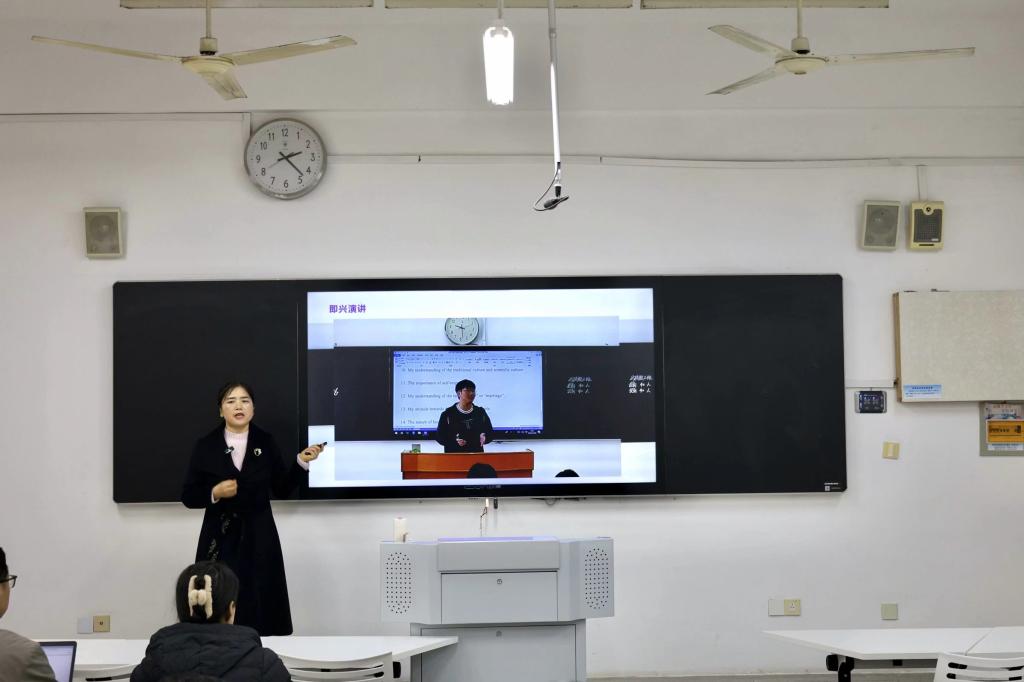 为了将课程思政元素更好的融入课堂教学,进一步提高英语课堂综合教学效果,外国语学院于11月15号下午在4108教室举办了第18期教学沙龙活动。本次沙龙活动主题为“课程思政视域下《高级综合英语》教学创新与实践”,由外国语学院丁爱群老师主讲。施正荣副校长和全体外国语学院领导也参加了此次观摩活动,活动由外国语学院王善江副院长主持。
