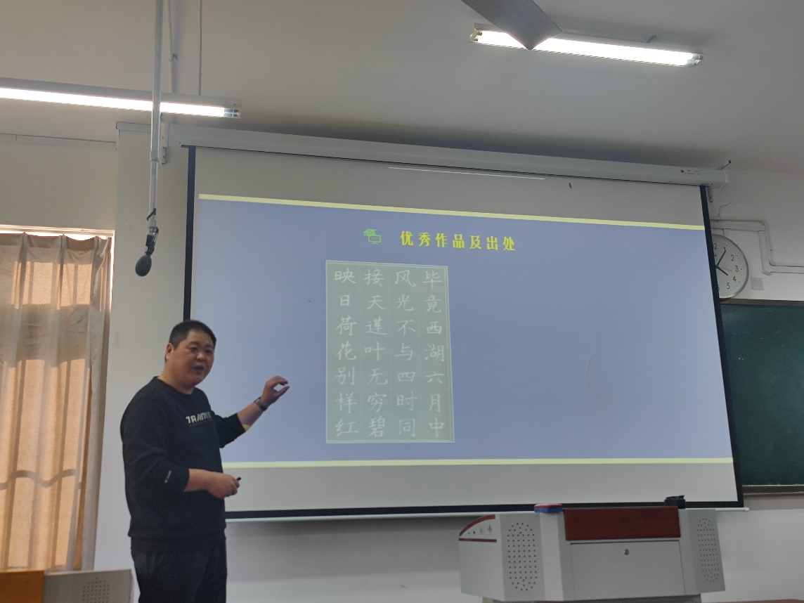 本次活动主题是“教学板书设计与优化”,由艺术与传媒学院美术系书法教师张志远主讲。张老师针对教学板书常见问题,从范本选择、用笔、笔画书写、字形结构原则与技巧等方面做了详细的讲解。讲座结束,参会教师们针对实际教学中遇到的问题进行了热烈的讨论。